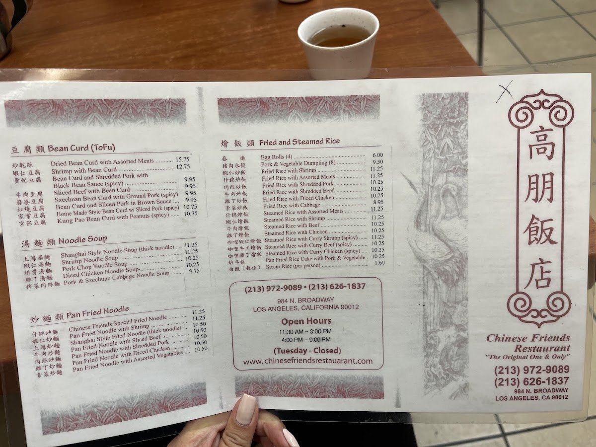 Welcome to Chinese Friends Restaurant, a hidden gem nestled at 984 N Broadway in Los Angeles. This cozy spot has been serving delicious, authentic Chinese cuisine for over two decades, and it shows in the quality of every dish. With friendly staff and a warm atmosphere, this restaurant is not just a place to eat; it's a culinary experience that keeps customers coming back.